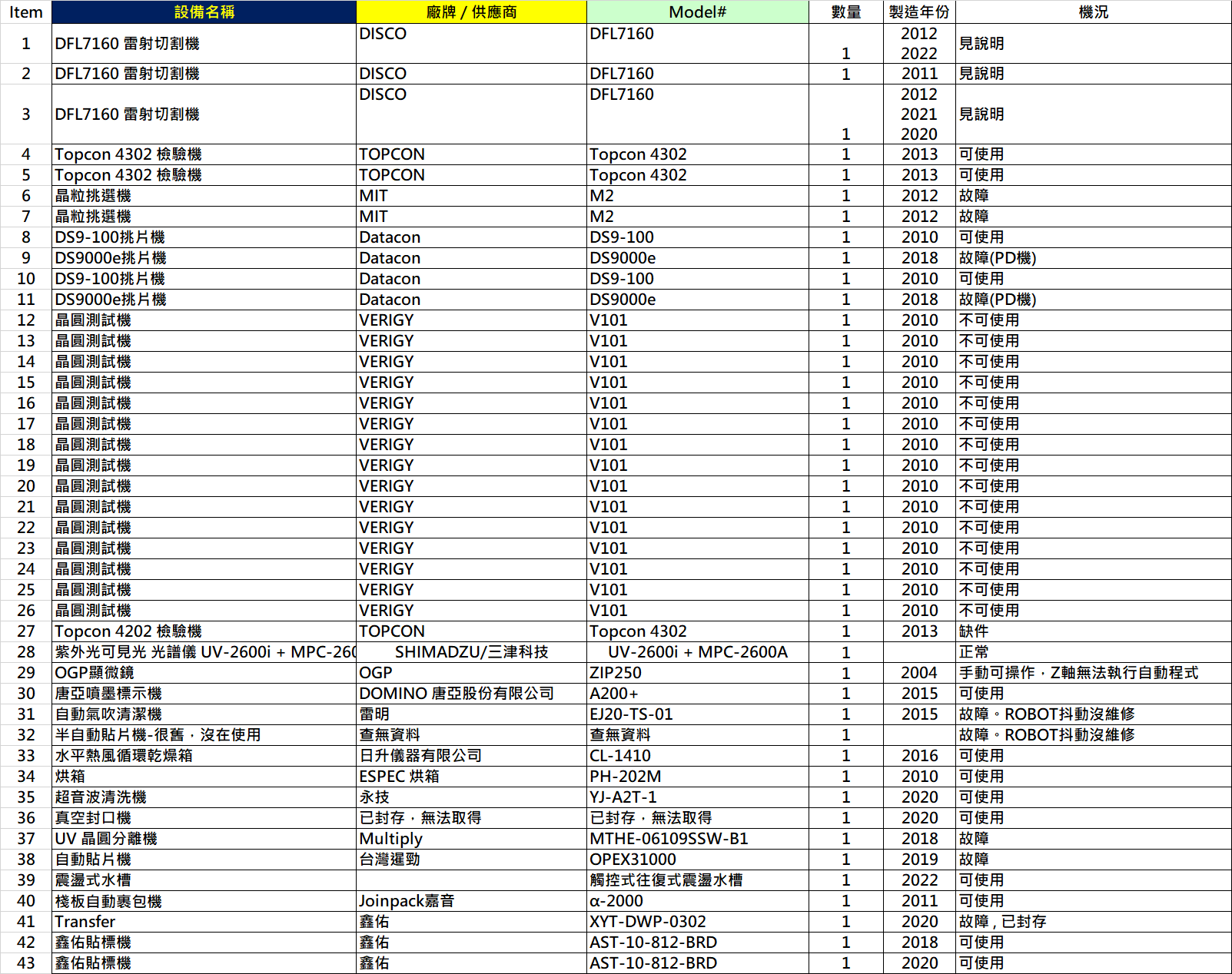 SELL | DISCO DFL7160 Laser Saw 3 sets / DATACON DS9-100 / DS9000e Sorter 4 sets / MIT M2 Die Sorter 2 sets / TOPCON VI-4302 Wafer Defect Inspection Machine 4 sets / VERIGY V101 Tester 15sets